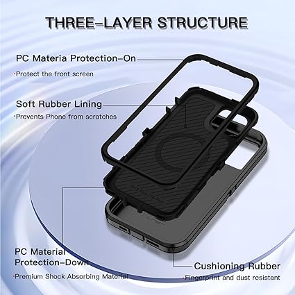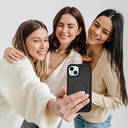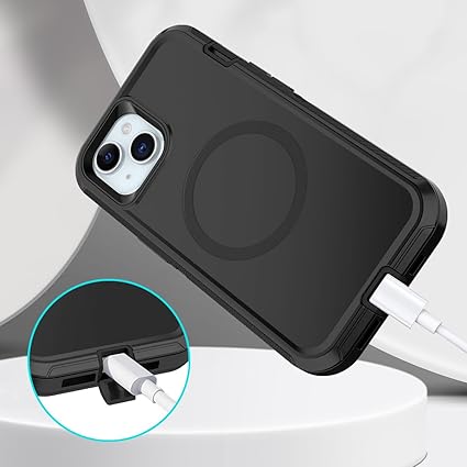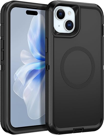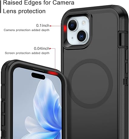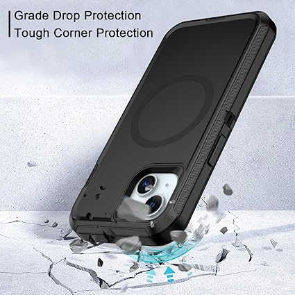 The Defender Pro case for iPhone 15 has a rugged 3-layer design featuring a hard shell interior and a shock-absorbing TPU outer layer. It provides reliable 20 ft drop protection and has a textured grip for a secure hold in hand. The case has full MagSafe compatibility for easy charging and accessories, providing durability, comfort, and usability for everyday or outdoor adventures.