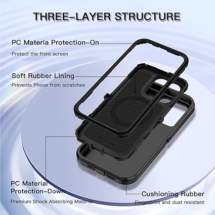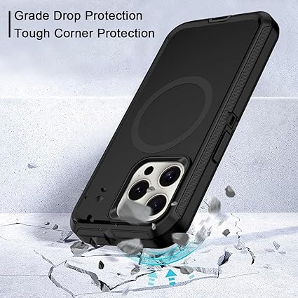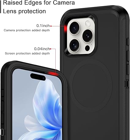 The Defender Pro case for iPhone 15 Pro Max has a rugged 3-layer design featuring a hard shell interior and a shock-absorbing TPU outer layer. It provides reliable 20 ft drop protection and has a textured grip for a secure hold in hand. The case has full MagSafe compatibility for easy charging and accessories, providing durability, comfort, and usability for everyday or outdoor adventures.